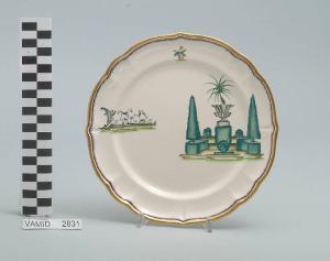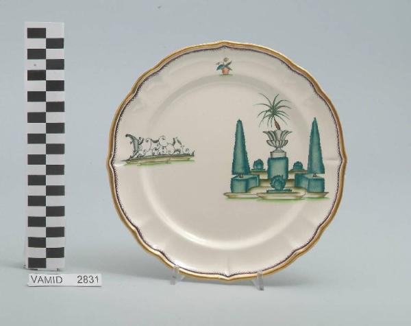 • NOTIZIE STORICO CRITICHE Il piatto da frutta in esame fa parte del servizio forma "Vecchio Milano" con decoro "Lago Maggiore": vi è raffigurata una veduta di un giardino all'italiana con cipressi e siepi di bossolo potati secondo l'ars topiaria ed elementi decorativi come un grande vaso in pietra contenente una palma nana. Insieme alla veduta sono presenti altri due decori in riferimento ai giardini del lago: un'inferriata in ferro battuto in stile Settecento (forse una recinzione) e un vaso di coccio con una pianta floreale. Per il suo clima mite e la posizione amena e soleggiata il Lago Maggiore è da sempre luogo di ville e di giardini splendidi come il grandioso giardino barocco all'italiana dell'Isola Bella o quello stupendo in stile inglese dell'Isola Madre o, ancora, quelli che attorniano molte ville storiche come la villa Pallavicini a Stresa, la Villa De Angeli Frua a Laveno o quella Bozzolo a Casalzuigno. Inevitabile che Andlovitz cogliesse in questi affascinanti insiemi di natura, arte e paesaggio una delle peculiarità più interessanti del Lago da riproporre in svariate declinazioni sul suo straordinario servizio. Questi decori sono rappresentati in un'atmosfera sospesa e silenziosa, seppur ridente nella resa stilizzata e nel fresco cromatismo delle raffigurazioni. Fin dalla sua nomina a direttore artistico della "S.C.I.", Guido Andlovitz si prefisse di rigenerare le forme tradizionali con decori nuovi. E' il caso della forma "Vecchio Milano" cui adattò nel 1931 il nuovissimo decoro "Lago Maggiore", a conferma che una decorazione nuova, se concepita organicamente, può conferire un aspetto attuale e "scattante" anche a una bella forma tradizionale. Fu certamente uno dei servizi più prestigiosi della produzione del momento se Andlovitz lo concepì in piccolissima serie e se l'azienda gli consentì - caso unico- di firmarlo nella marca. La scritta Verbano e la data 1931 presenti nel marchio suggeriscono che probabilmente il servizio fu realizzato per celebrare nel 1931 l'inizio della produzione di porcellana da tavola a Laveno nello stabilimento Verbano. Nell'ambito dei repertori decorativi creati dall'Andlovtz il decoro "Lago Maggiore" rappresenta un modo frazionato di raffigurare il paesaggio, definito da Mario Munari a "scena spezzata". L'impianto decorativo di queste ceramiche rifugge dalla centralità e dalla strutturazioni lungo diretrici ortogonali, mentre vi predominano l'asimmetria e le fughe visuali sghembe che risentono del gusto per la cineseria e il giapponismo. La semplificazione geometrica degli elementi e il modo di sfumare i corpi nel'intento di suggerirne la volumetria ricorda le opere di Carlo Carrà degli anni venti. Nel decoro "Lago Maggiore" sono presenti espressioni diversificate di un tema molto caro a Guido Andlovitz: i "paesaggi d'acqua" con particolare ricorrenza delle 'barche' raffigurate in una vasta gamma di tipi, generalmente riprese da modelli reali e con divertenti variazioni fantastiche. Il decoro Lago fu applicato in un primo momento sulla forma "Vecchio Milano", poi sulla forma "Pomezia" (1936 ca.). Del decoro Lago esistono diversi disegni originali a matita, pastello, inchiostro e acquerello su carta conservati nel fondo archivistico della "S.C.I.": alcuni di questi raffigurano il decoro proprio sulla forma "Vecchio Milano" con le rifiniture che compaiono sui pezzi finiti. Nel Museo è conservato anche un altro servizio forma "Vecchio Milano" con decoro "Lago Maggiore", ma più ridotto nella quantità e nella varietà dei componenti e con filettatura monocroma (num. inv. 2051...3517). Negli anni '90 la Richard Ginori ha rimesso in produzione il servizio Lago.\nIl servizio in esame è eseguito a colaggio, mentre i decori sono realizzati a decalcomania (o transfer): si vedano in proposito le lastre in rame acciaiato conservate nel Museo e raffiguranti molti dei decori presenti nel servizio in combinazioni diversificate (nn. inv. 2480, 2483, 2484, 2485). Tipologicamente si lega ad un servizio da caffé (num. inv. 2672...