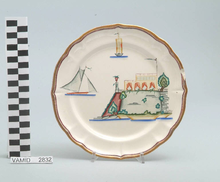 - NOTIZIE STORICO CRITICHE Il piatto da frutta in esame fa parte del servizio forma "Vecchio Milano" con decoro "Lago Maggiore": vi sono raffigurati uno scorcio (una terrazza sul lago con loggiato e tendaggi, forse appartenente a un albergo) ed elementi caratteristici della vita sul lago (una barca a vela a vele spiegate e una barca da pesca tipica, detta burchiello, in navigazione) rappresentati in un'atmosfera sospesa e silenziosa, seppur ridente nella resa stilizzata e nel fresco cromatismo delle raffigurazioni. Fin dalla sua nomina a direttore artistico della "S.C.I.", Guido Andlovitz si prefisse di rigenerare le forme tradizionali con decori nuovi. E' il caso della forma "Vecchio Milano" cui adattò nel 1931 il nuovissimo decoro "Lago Maggiore", a conferma che una decorazione nuova, se concepita organicamente, può conferire un aspetto attuale e "scattante" anche a una bella forma tradizionale. Fu certamente uno dei servizi più prestigiosi della produzione del momento se Andlovitz lo concepì in piccolissima serie e se l'azienda gli consentì - caso unico- di firmarlo nella marca. La scritta Verbano e la data 1931 presenti nel marchio suggeriscono che probabilmente il servizio fu realizzato per celebrare nel 1931 l'inizio della produzione di porcellana da tavola a Laveno nello stabilimento Verbano. Nell'ambito dei repertori decorativi creati dall'Andlovtz il decoro "Lago Maggiore" rappresenta un modo frazionato di raffigurare il paesaggio, definito da Mario Munari a "scena spezzata". L'impianto decorativo di queste ceramiche rifugge dalla centralità e dalla strutturazioni lungo diretrici ortogonali, mentre vi predominano l'asimmetria e le fughe visuali sghembe che risentono del gusto per la cineseria e il giapponismo. La semplificazione geometrica degli elementi e il modo di sfumare i corpi nel'intento di suggerirne la volumetria ricorda le opere di Carlo Carrà degli anni venti. Nel decoro "Lago Maggiore" sono presenti espressioni diversificate di un tema molto caro a Guido Andlovitz: i "paesaggi d'acqua" con particolare ricorrenza delle 'barche' raffigurate in una vasta gamma di tipi, generalmente riprese da modelli reali e con divertenti variazioni fantastiche. Il decoro Lago fu applicato in un primo momento sulla forma "Vecchio Milano", poi sulla forma "Pomezia" (1936 ca.). Del decoro Lago esistono diversi disegni originali a matita, pastello, inchiostro e acquerello su carta conservati nel fondo archivistico della "S.C.I.": alcuni di questi raffigurano il decoro proprio sulla forma "Vecchio Milano" con le rifiniture che compaiono sui pezzi finiti. Nel Museo è conservato anche un altro servizio forma "Vecchio Milano" con decoro "Lago Maggiore", ma più ridotto nella quantità e nella varietà dei componenti e con filettatura monocroma (num. inv. 2051...3517). Negli anni '90 la Richard Ginori ha rimesso in produzione il servizio Lago.\nIl servizio in esame è eseguito a colaggio, mentre i decori sono realizzati a decalcomania (o transfer): si vedano in proposito le lastre in rame acciaiato conservate nel Museo e raffiguranti molti dei decori presenti nel servizio in combinazioni diversificate (nn. inv. 2480, 2483, 2484, 2485). Tipologicamente si lega ad un servizio da caffé (num. inv. 2672...2900).\nIl piatto da frutta è stato donato da Vanna Scotti Meregalli, nipote di Vanna Scotti, figlia dell'Ing. Luciano Scotti che fu direttore generale della "S.C.I." dal 1916.