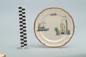 - NOTIZIE STORICO CRITICHE Il piatto da frutta in esame fa parte del servizio forma "Vecchio Milano" con decoro "Lago Maggiore": vi sono raffigurati uno scorcio (l'entrata di un porto con una barca da pesca in uscita e un pennone con scaletta d'avvistamento) ed elementi caratteristici della vita sul lago (una banchina con argano e una barca da pesca tipica, detta burchiello, in navigazione) rappresentati in un'atmosfera sospesa e silenziosa, seppur ridente nella resa stilizzata e nel fresco cromatismo delle raffigurazioni. Fin dalla sua nomina a direttore artistico della "S.C.I.", Guido Andlovitz si prefisse di rigenerare le forme tradizionali con decori nuovi. E' il caso della forma "Vecchio Milano" cui adattò nel 1931 il nuovissimo decoro "Lago Maggiore", a conferma che una decorazione nuova, se concepita organicamente, può conferire un aspetto attuale e "scattante" anche a una bella forma tradizionale. Fu certamente uno dei servizi più prestigiosi della produzione del momento se Andlovitz lo concepì in piccolissima serie e se l'azienda gli consentì - caso unico- di firmarlo nella marca. La scritta Verbano e la data 1931 presenti nel marchio suggeriscono che probabilmente il servizio fu realizzato per celebrare nel 1931 l'inizio della produzione di porcellana da tavola a Laveno nello stabilimento Verbano. Nell'ambito dei repertori decorativi creati dall'Andlovtz il decoro "Lago Maggiore" rappresenta un modo frazionato di raffigurare il paesaggio, definito da Mario Munari a "scena spezzata". L'impianto decorativo di queste ceramiche rifugge dalla centralità e dalla strutturazioni lungo diretrici ortogonali, mentre vi predominano l'asimmetria e le fughe visuali sghembe che risentono del gusto per la cineseria e il giapponismo. La semplificazione geometrica degli elementi e il modo di sfumare i corpi nel'intento di suggerirne la volumetria ricorda le opere di Carlo Carrà degli anni venti. Nel decoro "Lago Maggiore" sono presenti espressioni diversificate di un tema molto caro a Guido Andlovitz: i "paesaggi d'acqua" con particolare ricorrenza delle 'barche' raffigurate in una vasta gamma di tipi, generalmente riprese da modelli reali e con divertenti variazioni fantastiche. Il decoro Lago fu applicato in un primo momento sulla forma "Vecchio Milano", poi sulla forma "Pomezia" (1936 ca.). Del decoro Lago esistono diversi disegni originali a matita, pastello, inchiostro e acquerello su carta conservati nel fondo archivistico della "S.C.I.": alcuni di questi raffigurano il decoro proprio sulla forma "Vecchio Milano" con le rifiniture che compaiono sui pezzi finiti. Nel Museo è conservato anche un altro servizio forma "Vecchio Milano" con decoro "Lago Maggiore", ma più ridotto nella quantità e nella varietà dei componenti e con filettatura monocroma (num. inv. 2051...3517). Negli anni '90 la Richard Ginori ha rimesso in produzione il servizio Lago.\nIl servizio in esame è eseguito a colaggio, mentre i decori sono realizzati a decalcomania (o transfer): si vedano in proposito le lastre in rame acciaiato conservate nel Museo e raffiguranti molti dei decori presenti nel servizio in combinazioni diversificate (nn. inv. 2480, 2483, 2484, 2485). Tipologicamente si lega ad un servizio da caffé (num. inv. 2672...2900).\nIl piatto da frutta è stato donato da Vanna Scotti Meregalli, nipote di Vanna Scotti, figlia dell'Ing. Luciano Scotti che fu direttore generale della "S.C.I." dal 1916.