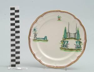 - NOTIZIE STORICO CRITICHE Il piatto da frutta in esame fa parte del servizio forma "Vecchio Milano" con decoro "Lago Maggiore": vi è raffigurata una veduta di un giardino all'italiana con un'esedra in muratura sullo sfondo con obelischi, cipressi e siepi di bossolo potati secondo l'ars topiaria. Insieme alla veduta sono presenti altri due decori in riferimento ai giardini del lago: una siepe di bosso con un vaso decorativo con palmizio e un vaso di coccio con una pianta ornamentale. Per il suo clima mite e la posizione amena e soleggiata il Lago Maggiore è da sempre luogo di ville e di giardini splendidi come il grandioso giardino barocco all'italiana dell'Isola Bella o quello stupendo in stile inglese dell'Isola Madre o, ancora, quelli che attorniano molte ville storiche come la villa Pallavicini a Stresa, la Villa De Angeli Frua a Laveno o quella Bozzolo a Casalzuigno. Inevitabile che Andlovitz cogliesse in questi affascinanti insiemi di natura, arte e paesaggio una delle peculiarità più interessanti del Lago da riproporre in svariate declinazioni sul suo straordinario servizio. Questi decori sono rappresentati in un'atmosfera sospesa e silenziosa, seppur ridente nella resa stilizzata e nel fresco cromatismo delle raffigurazioni. Fin dalla sua nomina a direttore artistico della "S.C.I.", Guido Andlovitz si prefisse di rigenerare le forme tradizionali con decori nuovi. E' il caso della forma "Vecchio Milano" cui adattò nel 1931 il nuovissimo decoro "Lago Maggiore", a conferma che una decorazione nuova, se concepita organicamente, può conferire un aspetto attuale e "scattante" anche a una bella forma tradizionale. Fu certamente uno dei servizi più prestigiosi della produzione del momento se Andlovitz lo concepì in piccolissima serie e se l'azienda gli consentì - caso unico- di firmarlo nella marca. La scritta Verbano e la data 1931 presenti nel marchio suggeriscono che probabilmente il servizio fu realizzato per celebrare nel 1931 l'inizio della produzione di porcellana da tavola a Laveno nello stabilimento Verbano. Nell'ambito dei repertori decorativi creati dall'Andlovtz il decoro "Lago Maggiore" rappresenta un modo frazionato di raffigurare il paesaggio, definito da Mario Munari a "scena spezzata". L'impianto decorativo di queste ceramiche rifugge dalla centralità e dalla strutturazioni lungo diretrici ortogonali, mentre vi predominano l'asimmetria e le fughe visuali sghembe che risentono del gusto per la cineseria e il giapponismo. La semplificazione geometrica degli elementi e il modo di sfumare i corpi nel'intento di suggerirne la volumetria ricorda le opere di Carlo Carrà degli anni venti. Nel decoro "Lago Maggiore" sono presenti espressioni diversificate di un tema molto caro a Guido Andlovitz: i "paesaggi d'acqua" con particolare ricorrenza delle 'barche' raffigurate in una vasta gamma di tipi, generalmente riprese da modelli reali e con divertenti variazioni fantastiche. Il decoro Lago fu applicato in un primo momento sulla forma "Vecchio Milano", poi sulla forma "Pomezia" (1936 ca.). Del decoro Lago esistono diversi disegni originali a matita, pastello, inchiostro e acquerello su carta conservati nel fondo archivistico della "S.C.I.": alcuni di questi raffigurano il decoro proprio sulla forma "Vecchio Milano" con le rifiniture che compaiono sui pezzi finiti. Nel Museo è conservato anche un altro servizio forma "Vecchio Milano" con decoro "Lago Maggiore", ma più ridotto nella quantità e nella varietà dei componenti e con filettatura monocroma (num. inv. 2051...3517). Negli anni '90 la Richard Ginori ha rimesso in produzione il servizio Lago.\nIl servizio in esame è eseguito a colaggio, mentre i decori sono realizzati a decalcomania (o transfer): si vedano in proposito le lastre in rame acciaiato conservate nel Museo e raffiguranti molti dei decori presenti nel servizio in combinazioni diversificate (nn. inv. 2480, 2483, 2484, 2485). Tipologicamente si lega ad un servizio da caffé (num. inv. 2672...2900).\nIl piatto da frutta è stato donato da