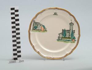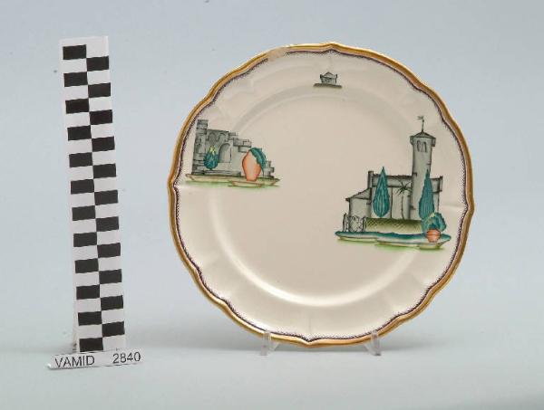 - NOTIZIE STORICO CRITICHE Il piatto da frutta in esame fa parte del servizio forma "Vecchio Milano" con decoro "Lago Maggiore": vi sono raffigurati una veduta laterale di una chiesa con campanile avente una cella campanaria aperta da bifore (vi sono delle affinità tra l'edificio in esame e la chiesa di Verbania Suna o quella di Oggebio) ed elementi caratteristici della vita sul lago (una scalinata in muratura con piante ornamentali e un vaso e un elemento simile a un piccolo sarcofago ma non chiaramente identificabile) rappresentati in un'atmosfera sospesa e silenziosa, seppur ridente nella resa stilizzata e nel fresco cromatismo delle raffigurazioni. Fin dalla sua nomina a direttore artistico della "S.C.I.", Guido Andlovitz si prefisse di rigenerare le forme tradizionali con decori nuovi. E' il caso della forma "Vecchio Milano" cui adattò nel 1931 il nuovissimo decoro "Lago Maggiore", a conferma che una decorazione nuova, se concepita organicamente, può conferire un aspetto attuale e "scattante" anche a una bella forma tradizionale. Fu certamente uno dei servizi più prestigiosi della produzione del momento se Andlovitz lo concepì in piccolissima serie e se l'azienda gli consentì - caso unico- di firmarlo nella marca. La scritta Verbano e la data 1931 presenti nel marchio suggeriscono che probabilmente il servizio fu realizzato per celebrare nel 1931 l'inizio della produzione di porcellana da tavola a Laveno nello stabilimento Verbano. Nell'ambito dei repertori decorativi creati dall'Andlovtz il decoro "Lago Maggiore" rappresenta un modo frazionato di raffigurare il paesaggio, definito da Mario Munari a "scena spezzata". L'impianto decorativo di queste ceramiche rifugge dalla centralità e dalla strutturazioni lungo diretrici ortogonali, mentre vi predominano l'asimmetria e le fughe visuali sghembe che risentono del gusto per la cineseria e il giapponismo. La semplificazione geometrica degli elementi e il modo di sfumare i corpi nel'intento di suggerirne la volumetria ricorda le opere di Carlo Carrà degli anni venti. Nel decoro "Lago Maggiore" sono presenti espressioni diversificate di un tema molto caro a Guido Andlovitz: i "paesaggi d'acqua" con particolare ricorrenza delle 'barche' raffigurate in una vasta gamma di tipi, generalmente riprese da modelli reali e con divertenti variazioni fantastiche. Il decoro Lago fu applicato in un primo momento sulla forma "Vecchio Milano", poi sulla forma "Pomezia" (1936 ca.). Del decoro Lago esistono diversi disegni originali a matita, pastello, inchiostro e acquerello su carta conservati nel fondo archivistico della "S.C.I.": alcuni di questi raffigurano il decoro proprio sulla forma "Vecchio Milano" con le rifiniture che compaiono sui pezzi finiti. Nel Museo è conservato anche un altro servizio forma "Vecchio Milano" con decoro "Lago Maggiore", ma più ridotto nella quantità e nella varietà dei componenti e con filettatura monocroma (num. inv. 2051...3517). Negli anni '90 la Richard Ginori ha rimesso in produzione il servizio Lago.\nIl servizio in esame è eseguito a colaggio, mentre i decori sono realizzati a decalcomania (o transfer): si vedano in proposito le lastre in rame acciaiato conservate nel Museo e raffiguranti molti dei decori presenti nel servizio in combinazioni diversificate (nn. inv. 2480, 2483, 2484, 2485). Tipologicamente si lega ad un servizio da caffé (num. inv. 2672...2900).\nIl piatto da frutta è stato donato da Vanna Scotti Meregalli, nipote di Vanna Scotti, figlia dell'Ing. Luciano Scotti che fu direttore generale della "S.C.I." dal 1916.