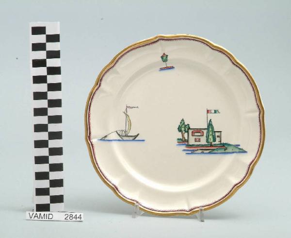 - NOTIZIE STORICO CRITICHE Il piatto da frutta in esame fa parte del servizio forma "Vecchio Milano" con decoro "Lago Maggiore": vi sono raffigurati uno scorcio (un fortino con bandiera italiana sulla riva del lago) ed elementi caratteristici della vita sul lago (una boa luminosa e una barca da pesca tipica, detta burchiello, in navigazione) rappresentati in un'atmosfera sospesa e silenziosa, seppur ridente nella resa stilizzata e nel fresco cromatismo delle raffigurazioni. Fin dalla sua nomina a direttore artistico della "S.C.I.", Guido Andlovitz si prefisse di rigenerare le forme tradizionali con decori nuovi. E' il caso della forma "Vecchio Milano" cui adattò nel 1931 il nuovissimo decoro "Lago Maggiore", a conferma che una decorazione nuova, se concepita organicamente, può conferire un aspetto attuale e "scattante" anche a una bella forma tradizionale. Fu certamente uno dei servizi più prestigiosi della produzione del momento se Andlovitz lo concepì in piccolissima serie e se l'azienda gli consentì - caso unico- di firmarlo nella marca. La scritta Verbano e la data 1931 presenti nel marchio suggeriscono che probabilmente il servizio fu realizzato per celebrare nel 1931 l'inizio della produzione di porcellana da tavola a Laveno nello stabilimento Verbano. Nell'ambito dei repertori decorativi creati dall'Andlovtz il decoro "Lago Maggiore" rappresenta un modo frazionato di raffigurare il paesaggio, definito da Mario Munari a "scena spezzata". L'impianto decorativo di queste ceramiche rifugge dalla centralità e dalla strutturazioni lungo diretrici ortogonali, mentre vi predominano l'asimmetria e le fughe visuali sghembe che risentono del gusto per la cineseria e il giapponismo. La semplificazione geometrica degli elementi e il modo di sfumare i corpi nel'intento di suggerirne la volumetria ricorda le opere di Carlo Carrà degli anni venti. Nel decoro "Lago Maggiore" sono presenti espressioni diversificate di un tema molto caro a Guido Andlovitz: i "paesaggi d'acqua" con particolare ricorrenza delle 'barche' raffigurate in una vasta gamma di tipi, generalmente riprese da modelli reali e con divertenti variazioni fantastiche. Il decoro Lago fu applicato in un primo momento sulla forma "Vecchio Milano", poi sulla forma "Pomezia" (1936 ca.). Del decoro Lago esistono diversi disegni originali a matita, pastello, inchiostro e acquerello su carta conservati nel fondo archivistico della "S.C.I.": alcuni di questi raffigurano il decoro proprio sulla forma "Vecchio Milano" con le rifiniture che compaiono sui pezzi finiti. Nel Museo è conservato anche un altro servizio forma "Vecchio Milano" con decoro "Lago Maggiore", ma più ridotto nella quantità e nella varietà dei componenti e con filettatura monocroma (num. inv. 2051...3517). Negli anni '90 la Richard Ginori ha rimesso in produzione il servizio Lago.\nIl servizio in esame è eseguito a colaggio, mentre i decori sono realizzati a decalcomania (o transfer): si vedano in proposito le lastre in rame acciaiato conservate nel Museo e raffiguranti molti dei decori presenti nel servizio in combinazioni diversificate (nn. inv. 2480, 2483, 2484, 2485). Tipologicamente si lega ad un servizio da caffé (num. inv. 2672...2900).\nIl piatto da frutta è stato donato da Vanna Scotti Meregalli, nipote di Vanna Scotti, figlia dell'Ing. Luciano Scotti che fu direttore generale della "S.C.I." dal 1916.