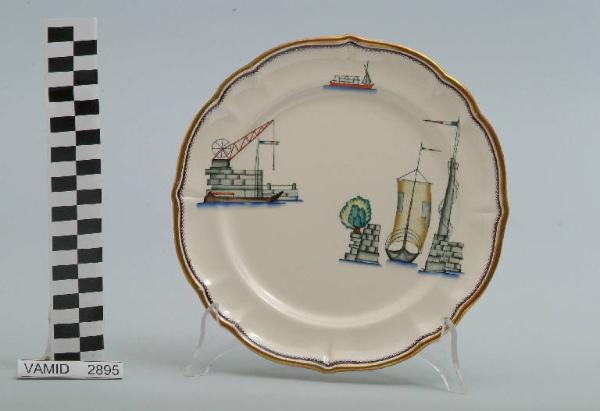 - NOTIZIE STORICO CRITICHE Il piatto da frutta in esame fa parte del servizio forma "Vecchio Milano" con decoro "Lago Maggiore": vi sono raffigurati uno scorcio (l'entrata di un porto con una barca da pesca in uscita e un pennone con scaletta d'avvistamento) ed elementi caratteristici della vita sul lago (una banchina con argano e una barca da pesca tipica, detta burchiello, in navigazione) rappresentati in un'atmosfera sospesa e silenziosa, seppur ridente nella resa stilizzata e nel fresco cromatismo delle raffigurazioni. Fin dalla sua nomina a direttore artistico della "S.C.I.", Guido Andlovitz si prefisse di rigenerare le forme tradizionali con decori nuovi. E' il caso della forma "Vecchio Milano" cui adattò nel 1931 il nuovissimo decoro "Lago Maggiore", a conferma che una decorazione nuova, se concepita organicamente, può conferire un aspetto attuale e "scattante" anche a una bella forma tradizionale. Fu certamente uno dei servizi più prestigiosi della produzione del momento se Andlovitz lo concepì in piccolissima serie e se l'azienda gli consentì - caso unico- di firmarlo nella marca. La scritta Verbano e la data 1931 presenti nel marchio suggeriscono che probabilmente il servizio fu realizzato per celebrare nel 1931 l'inizio della produzione di porcellana da tavola a Laveno nello stabilimento Verbano. Nell'ambito dei repertori decorativi creati dall'Andlovtz il decoro "Lago Maggiore" rappresenta un modo frazionato di raffigurare il paesaggio, definito da Mario Munari a "scena spezzata". L'impianto decorativo di queste ceramiche rifugge dalla centralità e dalla strutturazioni lungo diretrici ortogonali, mentre vi predominano l'asimmetria e le fughe visuali sghembe che risentono del gusto per la cineseria e il giapponismo. La semplificazione geometrica degli elementi e il modo di sfumare i corpi nel'intento di suggerirne la volumetria ricorda le opere di Carlo Carrà degli anni venti. Nel decoro "Lago Maggiore" sono presenti espressioni diversificate di un tema molto caro a Guido Andlovitz: i "paesaggi d'acqua" con particolare ricorrenza delle 'barche' raffigurate in una vasta gamma di tipi, generalmente riprese da modelli reali e con divertenti variazioni fantastiche. Il decoro Lago fu applicato in un primo momento sulla forma "Vecchio Milano", poi sulla forma "Pomezia" (1936 ca.). Del decoro Lago esistono diversi disegni originali a matita, pastello, inchiostro e acquerello su carta conservati nel fondo archivistico della "S.C.I.": alcuni di questi raffigurano il decoro proprio sulla forma "Vecchio Milano" con le rifiniture che compaiono sui pezzi finiti. Nel Museo è conservato anche un altro servizio forma "Vecchio Milano" con decoro "Lago Maggiore", ma più ridotto nella quantità e nella varietà dei componenti e con filettatura monocroma (num. inv. 2051...3517). Negli anni '90 la Richard Ginori ha rimesso in produzione il servizio Lago.\nIl servizio in esame è eseguito a colaggio, mentre i decori sono realizzati a decalcomania (o transfer): si vedano in proposito le lastre in rame acciaiato conservate nel Museo e raffiguranti molti dei decori presenti nel servizio in combinazioni diversificate (nn. inv. 2480, 2483, 2484, 2485). Tipologicamente si lega ad un servizio da caffé (num. inv. 2672...2900).\nIl piatto da frutta è stato donato da Vanna Scotti Meregalli, nipote di Vanna Scotti, figlia dell'Ing. Luciano Scotti che fu direttore generale della "S.C.I." dal 1916.
