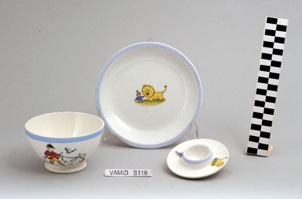 - NOTIZIE STORICO CRITICHE La ciotola appartiene a un servizio da tavola da bambino, composto da tre elementi (nn. inv. 2913, 2916, 2919) e realizzato in terraglia bianca decorata con decalcomanie con scenette di animali e bambini. Nel disegno, stilizzato e molto colorato per attirare l'attenzione dei bambini, vi sono delle strette affinità con le tipologie disegnative presenti nei contemporanei ambum da disegno per l'infanzia (cfr. "Il mazzolino", "Roselline"). La datazione del servizio dovrebbe coincidere con la data presente nella marca sotto alla ciotola "54".