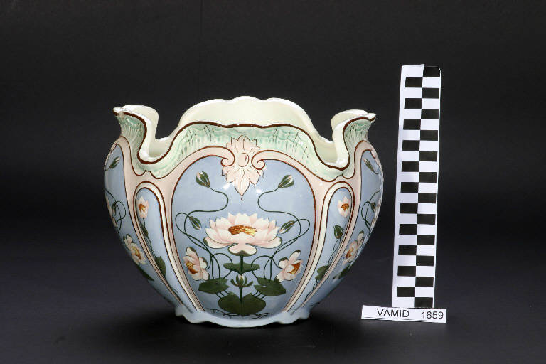 Vaso portafiori di forma bassa e svasata con orlo ondulato imitante petali. L'oggetto è decorato a mano con gruppi di ninfee su sfondo azzurro e verde acqua. Rifiniture in marrone.