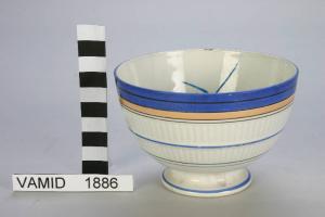 Ciotola da colazione a costole prodotta a stampo, con decorazione a strisce di colore (blu, nero e lustro color pesca) alternati al bianco della tazza.