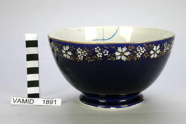 Grande ciotola decorata al bordo superiore con motivi floreali in bianco e giallo opaco sopra smalto, su fondo blu cobalto. Rifiniture in oro lungo il bordo superiore e lungo il piede.