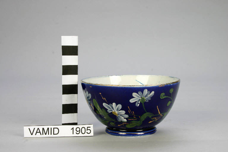 Ciotola liscia decorata a mano con motivi floreali a smalto bianco, giallo e verde su fondo a smalto blu cobalto. Rifiniture in oro brillante.