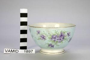 Ciotola da colazione con decorazione floreale eseguita con transfer a colori sopra smalto. Due cromo a foglie e fiori in viola e verde. Rifiniture in oro brillante lungo i bordi.