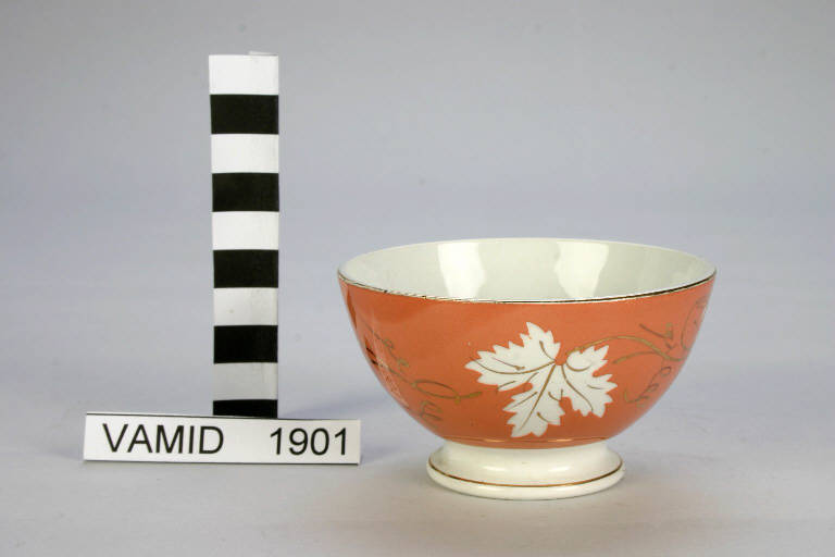 Ciotola da colazione decorata con motivo floreale (foglie e grappoli) in bianco impresso, su fondo smalto color rosa pesca. Rifiniture in oro brillante al bordo, al piede e sulla decorazione (rami).