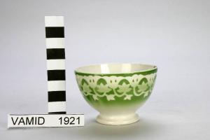 Piccola ciotola con decorazione floreale stilizzata (gigli e foglie) in bianco, su sfondo verde sfumato.