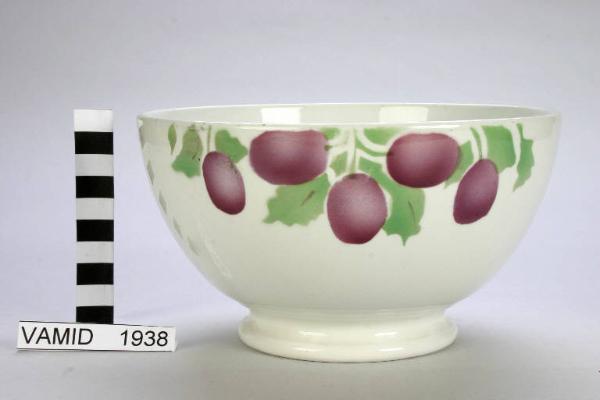 Ciotola da colazione decorata con susine e foglie rispettivamente in viola e verde su fondo bianco.
