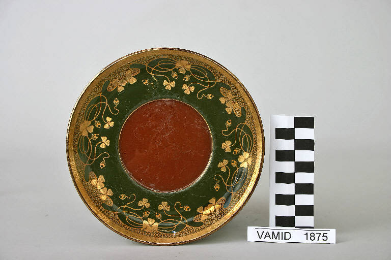 Piattino decorato a motivi floreali stilizzati in oro su sfondo verde. Il centro e il fondo sono decorati con smalto marrone. Rifiniture in oro brillante.