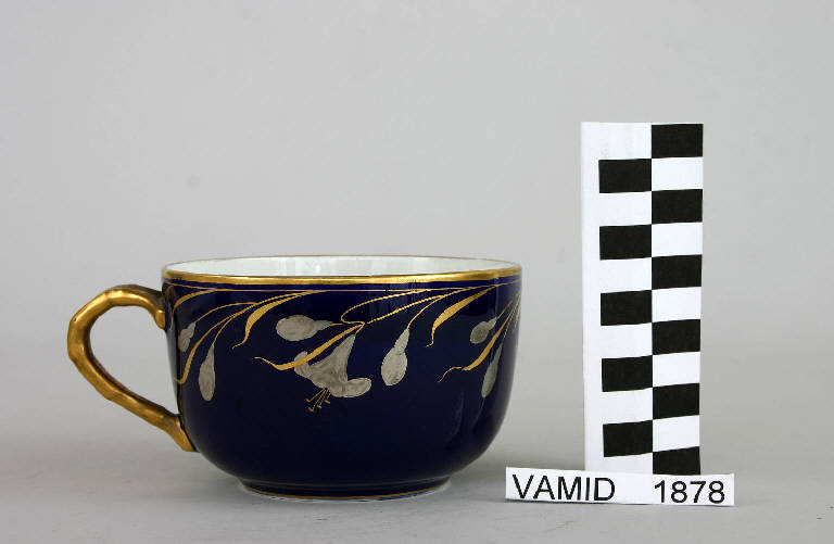 Tazza da thè decorata a motivi floreali stilizzati in oro brillante e argento, su sfondo in smalto blu cobalto. Interno bianco. Rifiniture lungo il bordo e sulla maniglia in oro.