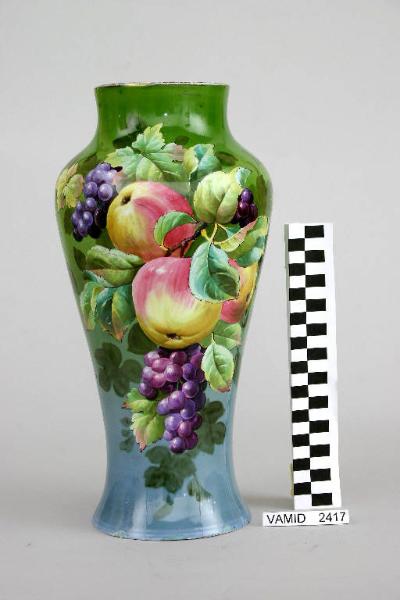 Vaso decorato a mano con frutta e foglie su sfondo sfumato dal verde, nella parte superiore, al blu, nella parte inferiore. Rifiniture in oro brillante lungo il bordo superiore.
