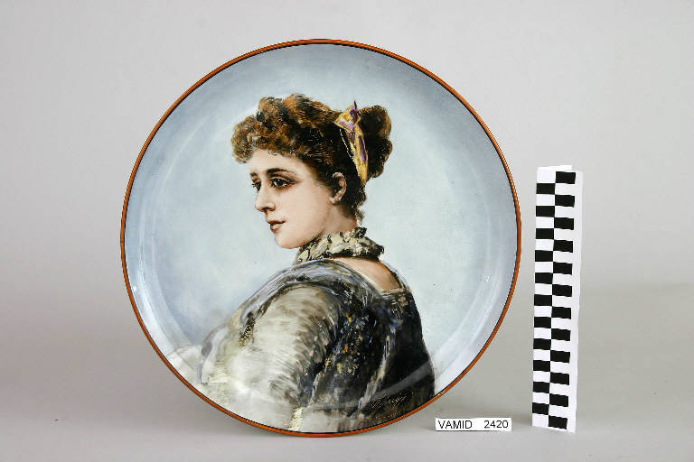 Piatto decorato a mano con un ritratto femminile di trequarti. Rifiniture in nero e marrone lungo il bordo.