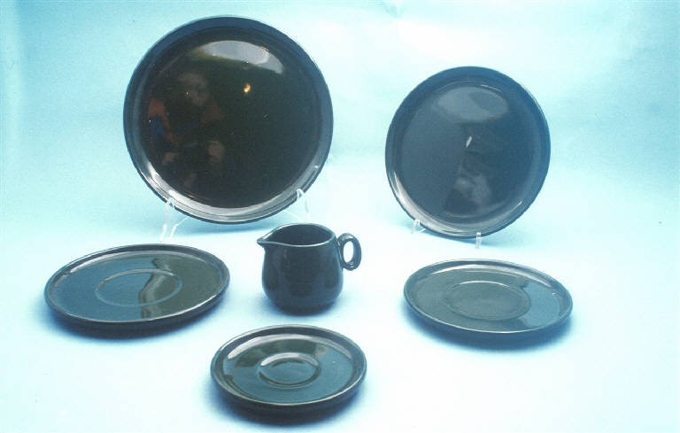 - NOTIZIE STORICO CRITICHE Il servizio da thè si lega tipologicamente ad un servizio da caffè (cfr. nn. inv. 1521-1522) e ad un servizio da tavola (cfr. nn. inv. 1525-1526) conservati nel Museo delle Terraglie di Laveno. Lo stile funzionale ed essenziale indica una datazione all'interno della seconda metà del Novecento. La ditta che lo ha prodotto ha realizzato nel 1998 la "Serie Fumo" (portapipe, posacenere, barattoli per tabacco) del designer Ambrogio Pozzi.