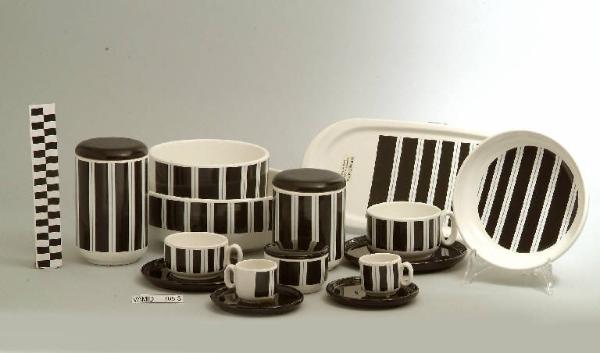 Il servizio da thè è composto da tre elementi: un portadolci e due tazze da thè di colore bianco con motivo a strisce verticali in nero e azzurro.