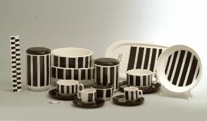 - NOTIZIE STORICO CRITICHE Il design essenziale e funzionale del servizio da thè, composto da tre elementi (nn. inv. 776, 780-781), indica una datazione ormai avanzata nel Novecento. Come riporta il Peregalli, è riferibile alla produzione di Albino Reggiori. L'artista lavenese cominciò a fare ceramica nel 1955 ma fu dopo il 1981 che la sua ricerca si sviluppò prevalentemente nel campo ceramistico, in modo particolare sui materiali ceramici legati alla propria terra. Tipologicamente l'oggetto in esame si lega ad un servizio da tavola (nn. inv. 773...783) e ad un servizio da caffè (nn. inv. 775, 778-779) conservati nel Museo delle Terraglie di Laveno. Il decoro è stato realizzato con la tecnica della decalcomania sottosmalto.