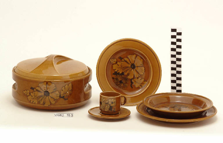 Il servizio da tavola è composto da quattro elementi: una casseruola, un piatto da frutta, un piatto fondo e un piatto piano di colore marrone con motivo floreale in nero.
