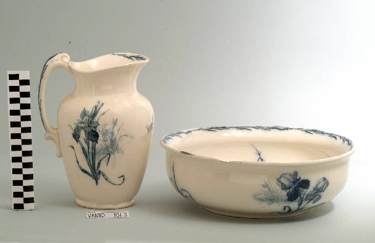 - NOTIZIE STORICO CRITICHE Il servizio igienico da camera, composto da due elementi (nn. inv. 620-621), è decorato sottosmalto con transfer di colore blu. Le prime manifatture a utilizzare la decorazione a stampa mediante una lastra di metallo incisa furono le francesi e le inglesi. La tecnica fu poi presto esportata in altri paesi. Questa tipo di decoro reso in modo naturalistico con chiaruscuro ed effetti di luce si diffuse in tutta Europa a partire dalla fine dell'Ottocento. Il confronto stilistico con altri servizi da camera della medesima manifattura decorati con motivi vegetali simili fanno ipotizzare una datazione a cavallo tra il XIX e il XX secolo.