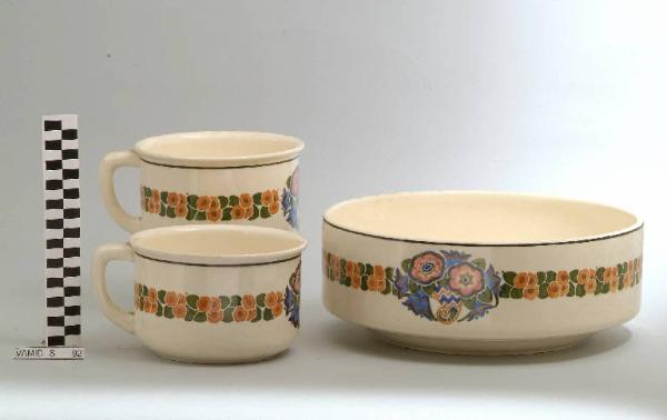 Il servizio igienico da camera è composto da tre elementi: un catino lavamano e due pitali di colore bianco con motivo decorativo floreale in verde, ocra, rosa, azzurro e marrone.