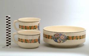- NOTIZIE STORICO CRITICHE Il servizio da camera è composto da tre elementi (nn. inv. 535-537). Il decoro è stato applicato sottosmalto con la tecnica della mascherine.
