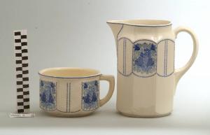 - NOTIZIE STORICO CRITICHE Il servizio in esame è composto da due elementi (nn. inv. 571-572). Il decoro è stato applicato sottosmalto con la tecnica delle mascherine. Il marchio "L J BUSSA" presente su un elemento del servizio potrebbe riferirsi alla ditta produttrice. In mancanza di dati certi si preferisce attribuire l'oggeto ad una generica manifattura europea.