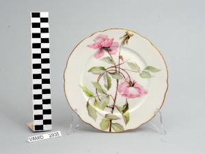 - NOTIZIE STORICO CRITICHE La decorazione floreale, realizzata con la tecnica della decalcomania con morbidi effetti di chiaroscuro e con una policromia ricca e sfumata, e la foggia ancora classica e morbidamente ondulata del piatto richiamano una tipologia molta in voga all'inizio del Novecento. La datazione al primo quarto è confermata dal marchio presente sul fondo impresso dalla Richard Ginori su tutti gli oggetti prodotti nello stabilimento di Doccia dal 1880 al 1930. Il piatto in esame, appartenente ad un servizio composto da dodici elementi (nn. inv. 1931-1935, 3248-3254), fa parte di una donazione di privati al Museo.