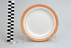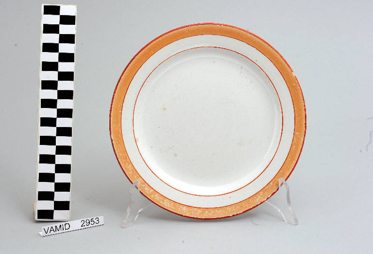 Piatto da frutta circolare; fondo bianco avorio decorato con fascia arancio; bordo rifinito in rosso.