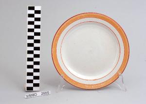 Piatto da frutta circolare; fondo bianco avorio decorato con fascia arancio; bordo rifinito in rosso.