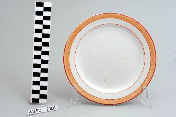 Piatto da frutta circolare; fondo bianco avorio decorato con fascia arancio; bordo rifinito in rosso.