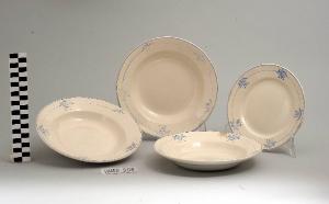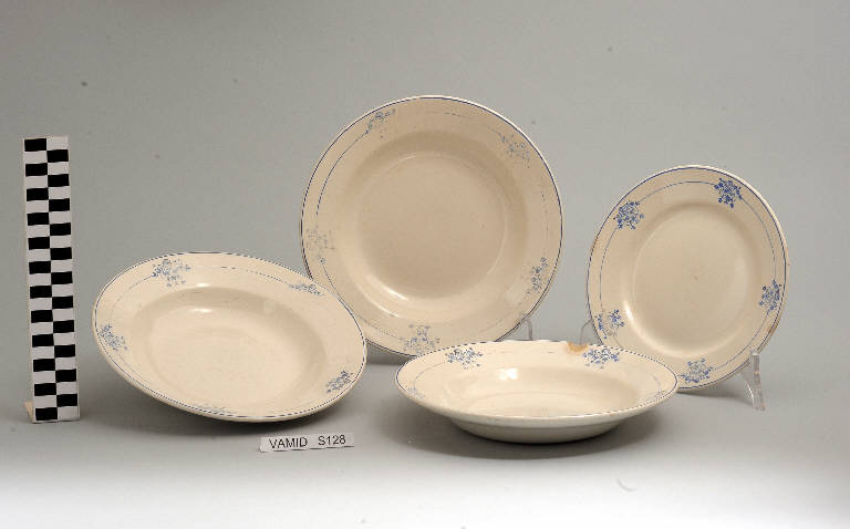 Serivizio composto da tre piatti fondi e un piatto da frutta di forma circolare; fondo bianco avorio con motivo vegetale stilizzato in blu lungo la tesa; bordo rifinito con filettatura blu.