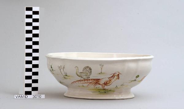 Zuppiera di forma ovale modellata con una profilatura incisa; restringimento in prossimità del piede; fondo color bianco avorio con animali policromi ai due lati.