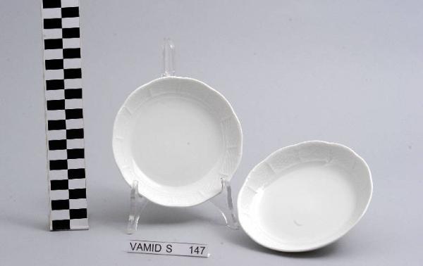 Servizio da frutta composto da due ciotole circolari con orlo leggermente ondulato; fondo bianco uniforme con motivo decorativo a rilievo.