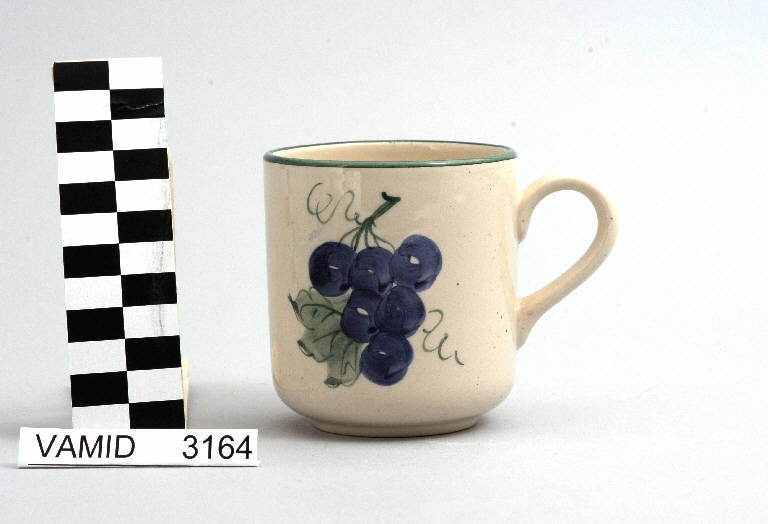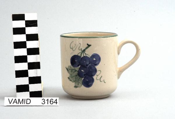 Tazza da colazione con corpo cilindrico; manico a "C" schiacciato; fondo bianco decorato con grappolo d'uva; bordo rifinito in verde.