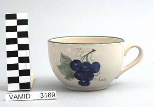Tazza con corpo leggermente svasato; manico a "C" schiacciato; fondo bianco decorato con grappolo d'uva; bordo rifinito in verde.