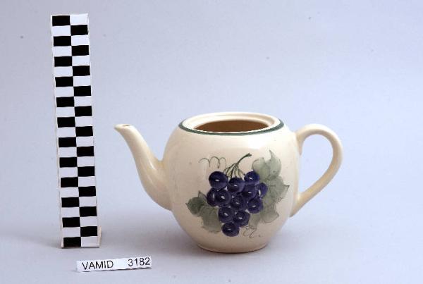 Teiera con corpo globulare; piede circolare; manico a "C" schiacciato; beccuccio sporgente; fondo bianco decorato con grappolo d'uva; bordo rifinito in verde.