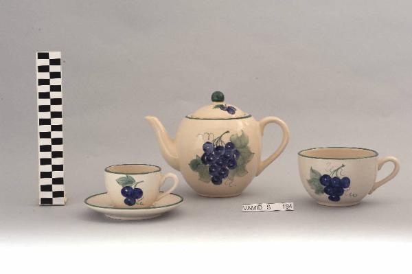 Servizio da thè composto da un piattino, due tazze, una teiera con relativo coperchio; fondo bianco decorato con grappolo d'uva; bordo rifinito in verde.