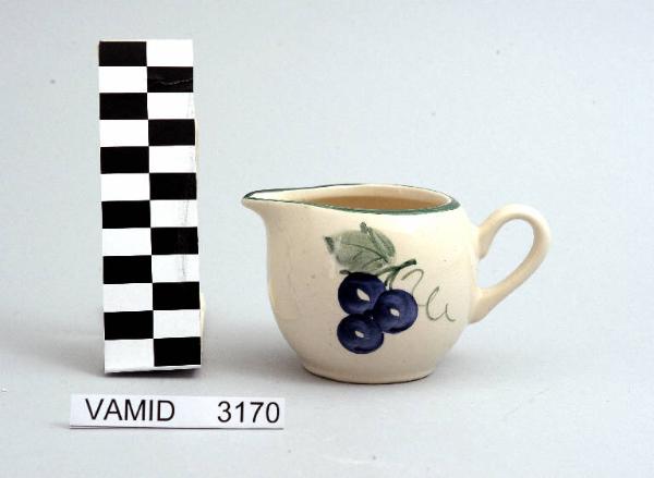 Lattiera con corpo globulare; piede circolare; manico a "C" schiacciato; ; beccuccio sporgente; fondo bianco decorato con grappolo d'uva; bordo rifinito in verde.