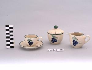 Servizio da caffè composto da un piattino, una tazzina, una lattiera e una zuccheriera; fondo bianco decorato con grappolo d'uva; bordo rifinito in verde.