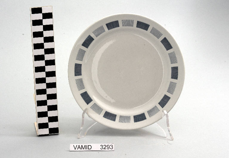 - NOTIZIE STORICO CRITICHE La foggia del manufatto in esame e la tipologia del decoro indicano una piena assimilazione della lezione del funzionalismo e quindi una datazione ormai avanzata nel Novecento confermata anche dal marchio presente sul fondo usato dalla Richard Ginori dal 1950 al 1990 circa. Il piatto, appartenente ad un servizio da tavola (num. inv. 3286...3658), fa parte di una donazione di privati al Museo.