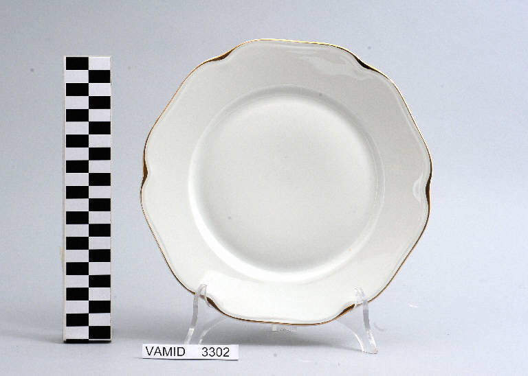 • NOTIZIE STORICO CRITICHE L'oggetto in esame, appartenente ad un servizio da tavola composto da cinquantaquattro elementi (num. inv. 3102...3565), rientra in una tipologia di vasellame di gusto popolare. Il design sobrio ed elegante, una linea ondulata e il bordo sottolineato da una filettatura oro denotano una ricerca stilistica riferibile alla metà del Novecento. La ditta produttrice, denominata "Società Ceramica del Verbano", venne fondata nel 1924 per competere con la porcellana di Doccia. Malgrado la qualità materica e formale dei suoi servizi, la "Verbano", non ebbe mai sul mercato della porcellana la potenza e l'inventiva della Ginori. Il piatto fa parte di una donazione di privati al Museo.
