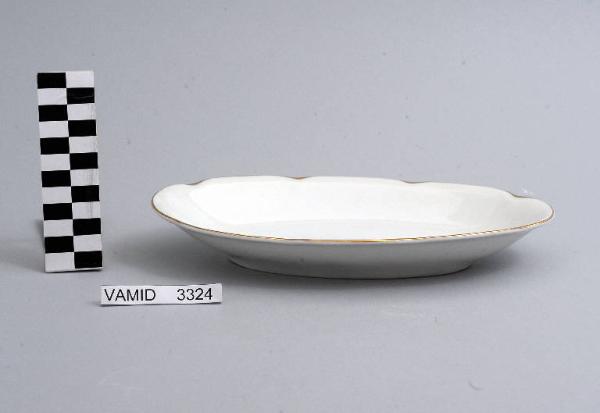 Raviera ovale di colore bianco; bordo ondulato rifinito con filettatura oro.