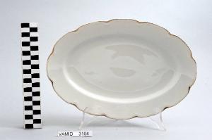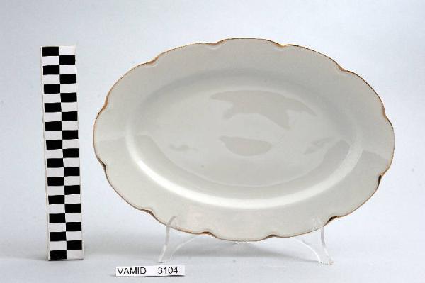 Piatto da portata ovale di colore bianco; bordo ondulato rifinito con filettatura oro.