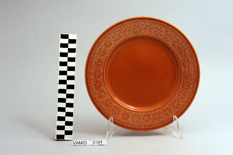Piatto piano circolare fondo color terracotta; motivi decorativi geometrici e vegetali a rilievo lungo la tesa.