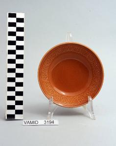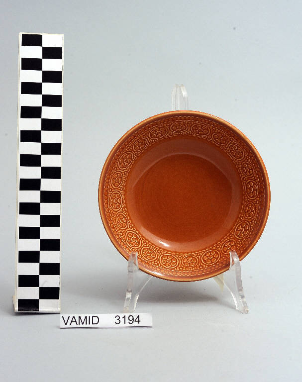 Ciotola circolare color terracotta; motivi decorativi geometrici e vegetali a rilievo lungo il bordo.