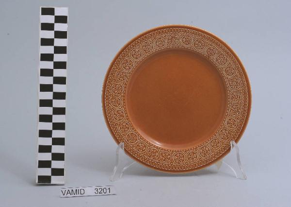 Piatto da frutta circolare color terracotta; motivi decorativi geometrici e vegetali a rilievo lungo la tesa.