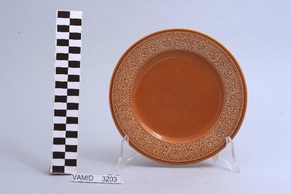 Piatto da frutta circolare color terracotta; motivi decorativi geometrici e vegetali a rilievo lungo la tesa.