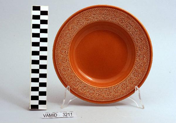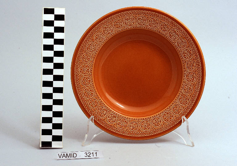Piatto fondo circolare color terracotta; motivi decorativi geometrici e vegetali a rilievo lungo la tesa.